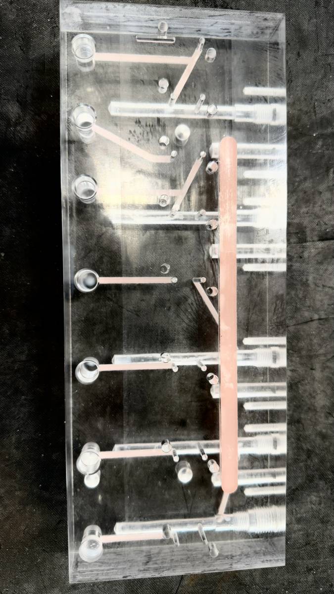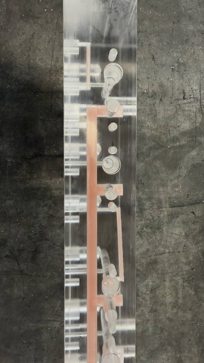 Les images ci-dessus montrent nos circuits gravés pneumatiques en cours de fabrication : gravés directement dans des blocs transparents, ces pièces assurent une visibilité optimale des flux pneumatiques. Nos solutions sont adaptées aux secteurs les plus exigeants, garantissant performance et durabilité.