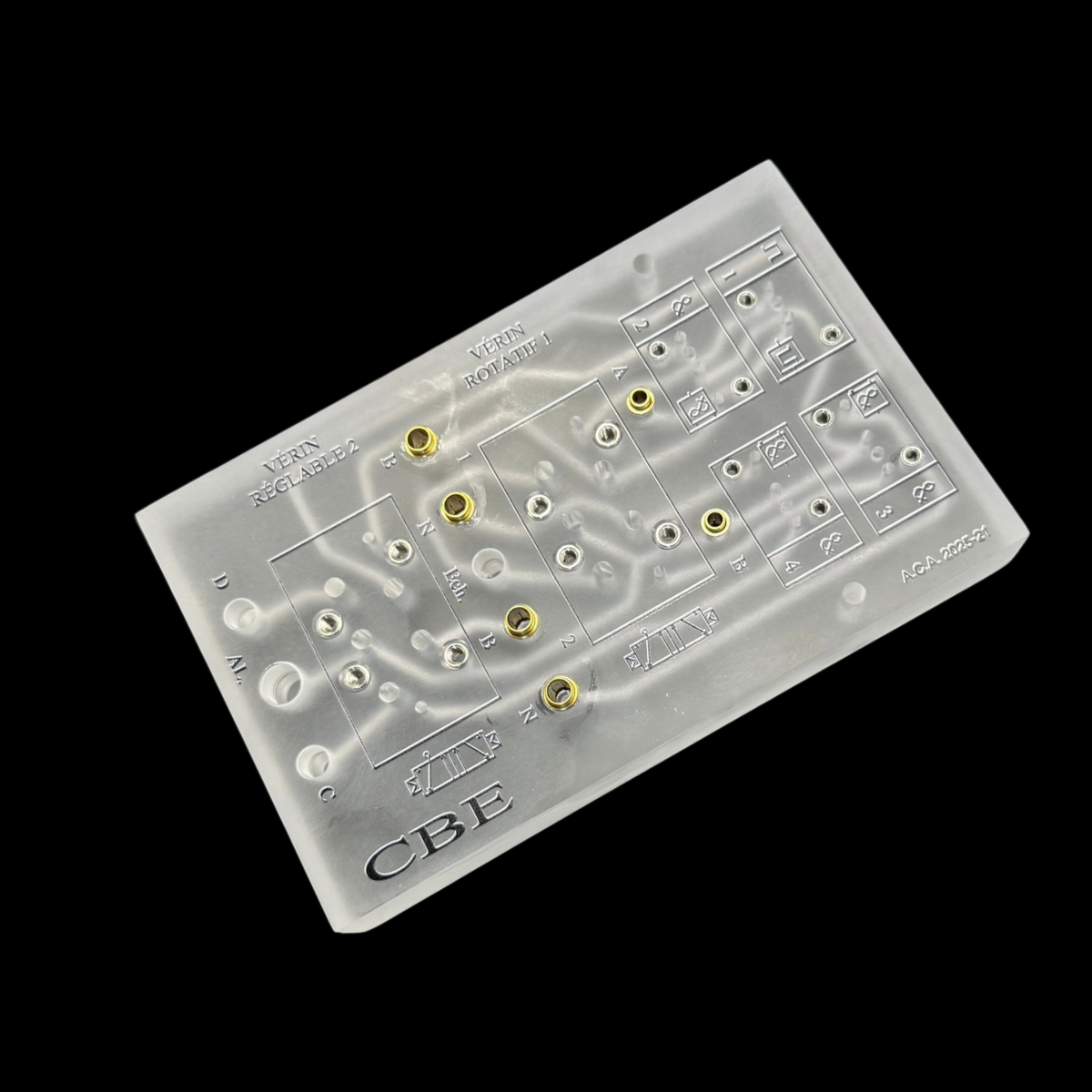 Ces circuits sont usinés dans des plaques de PMMA transparent, matériau rigide, durable et parfaitement adapté à la visualisation des canaux internes. Chaque circuit pneumatique gravé est étudié sur plan ou co-conçu avec le client pour garantir une compatibilité totale avec son système existant (dimensions, connectiques, flux d’air, etc.).