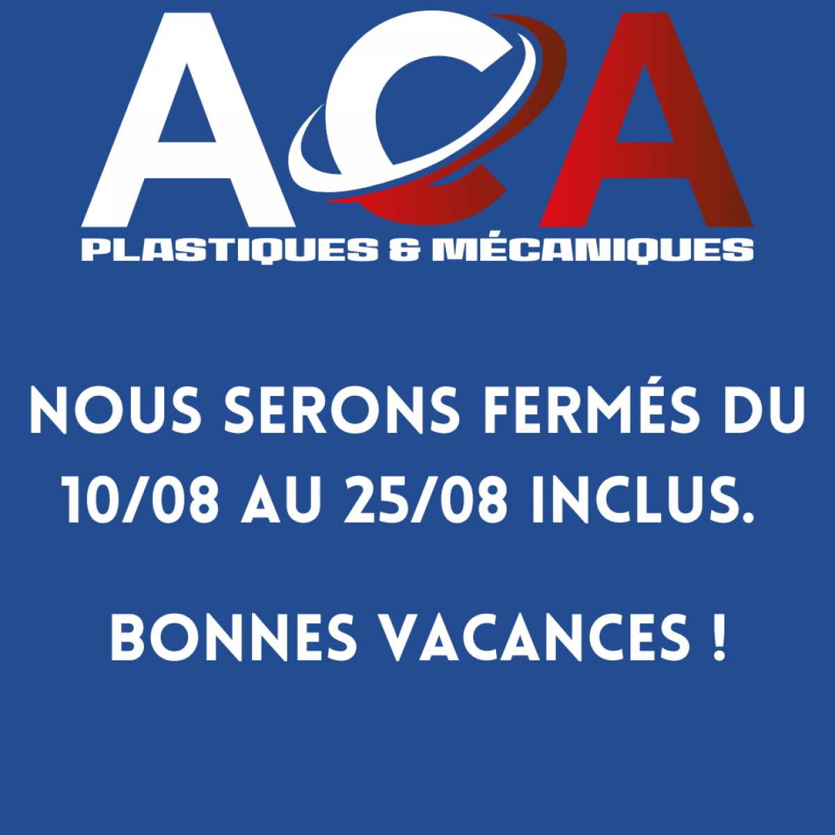 Nous informons notre aimable clientèle que ACA Plastiques & Mécaniques sera fermée pour les vacances annuelles du 09 août au 25 août. Pendant cette période, nos bureaux et ateliers seront inaccessibles. Nous reprendrons nos activités normales dès le 26 août. Nous vous remercions pour votre compréhension et vous souhaitons un excellent été. Pour toute urgence, n'hésitez pas à nous contacter par email, nous vous répondrons dès notre retour.