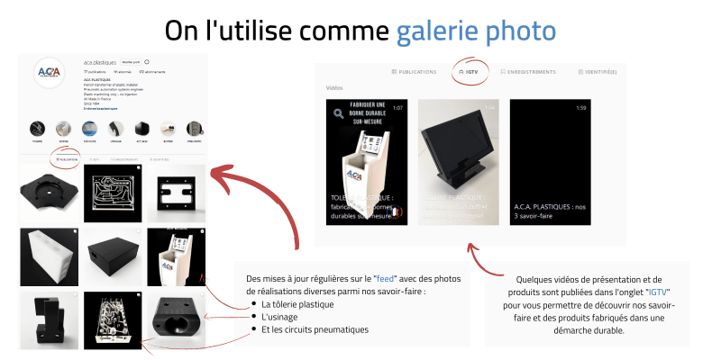 limiter les impressions de catalogues avec des photos en couleurs, on a préféré complété notre PDF de présentation de l'entreprise avec ce que l'on considère comme un catalogue interactif : notre page Instagram !